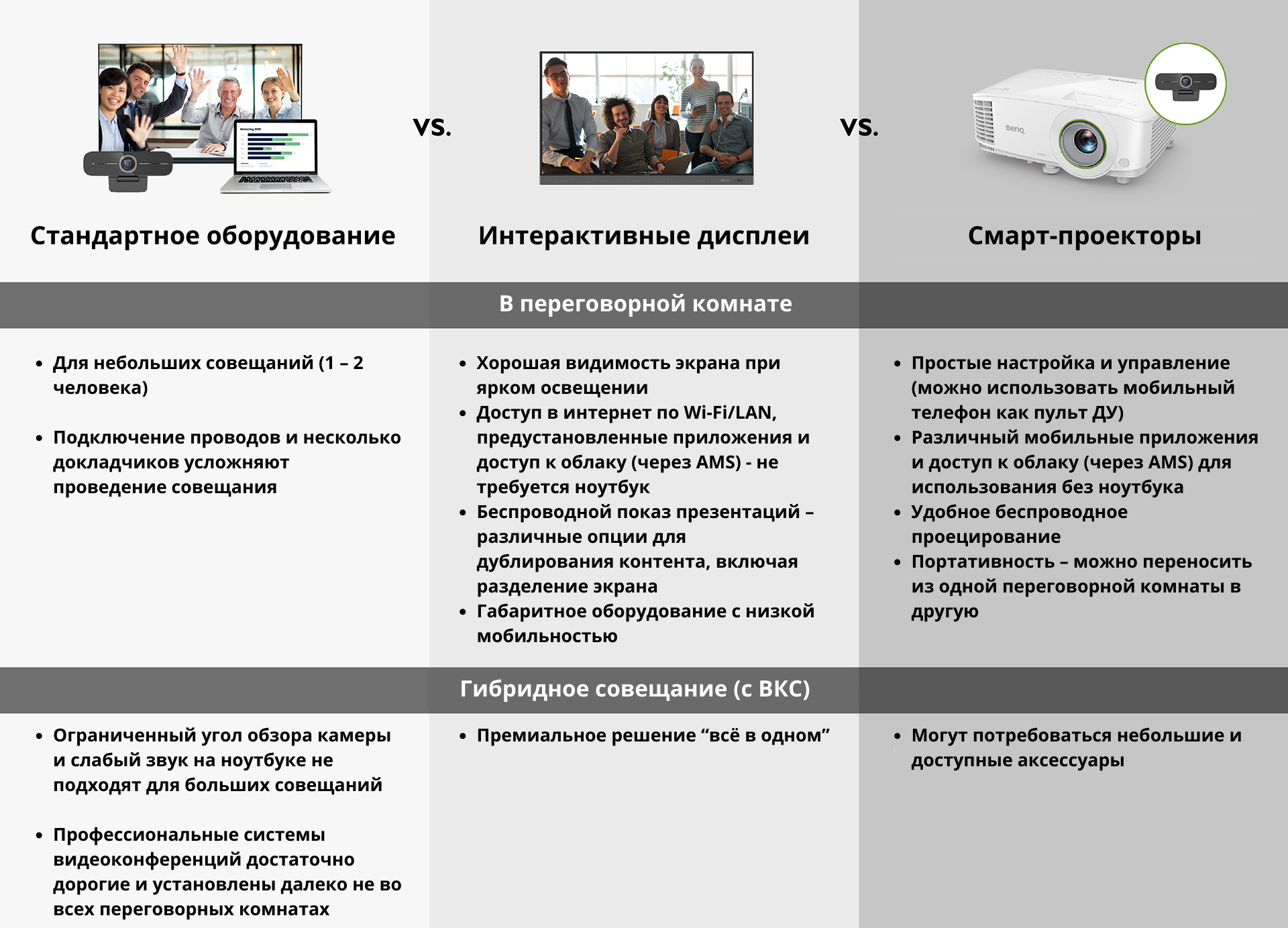 Эффективность и вовлеченность людей остаются наиболее важными факторами гибридных совещаний. Оборудование для видеоконференций, встречи без ПК, беспроводные проекторы и интерактивные панели — всё это решения, которые помогают избавиться от излишнего оборудования в переговорной комнате, сократить различные технические проблемы и повысить вовлеченность. Они также отлично совместимы с принципом использования собственных устройств (BYOD). На гибридных совещаниях нет времени на настройку и устранение неполадок. Вы хотите получить максимальную отдачу от каждой сессии. Вам нужна эффективность и вовлеченность, которые являются основными маркерами успешного совещания.