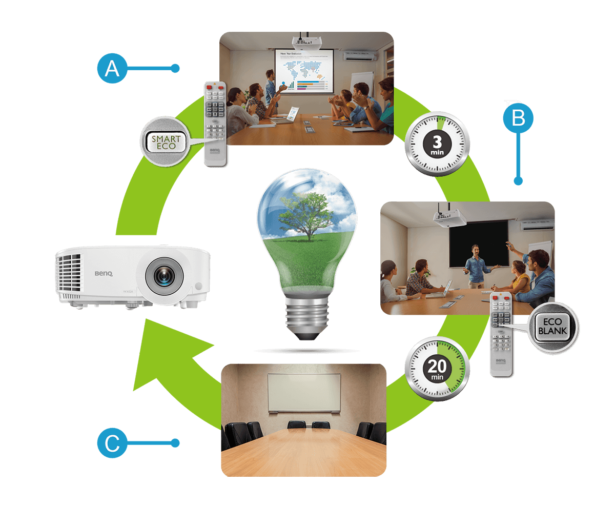 BenQ Eco Çevrim Sistemi, elektrik israfını ortadan kaldırır, toplantılardan önce ve sonra açma süresini azaltır ve bakım maliyetini en aza indirerek toplam mülkiyet maliyetini azaltır.
