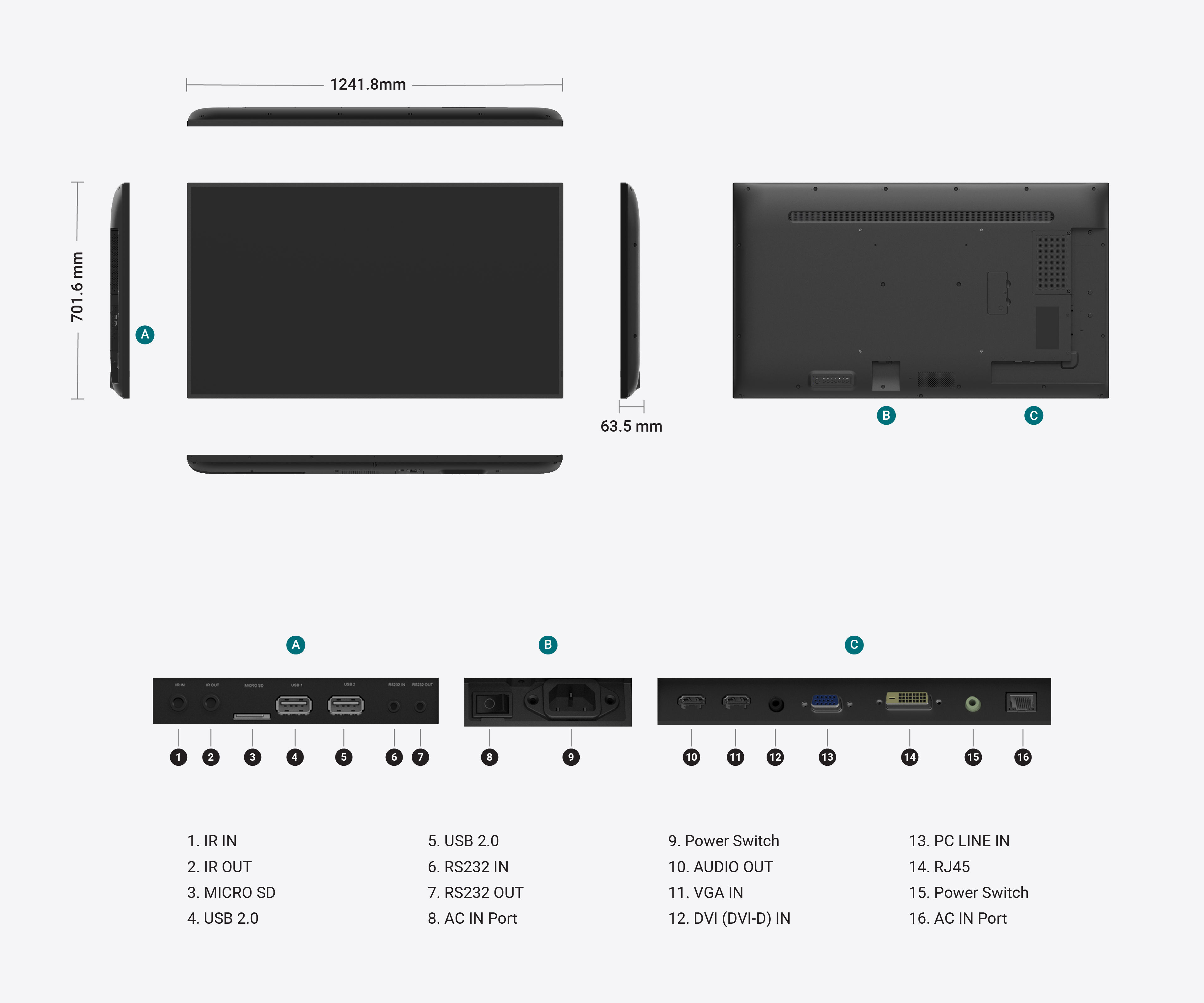 1241.8 × 712.6 × 63.5 mm (48.9 × 28.1 × 2.5 inch)
