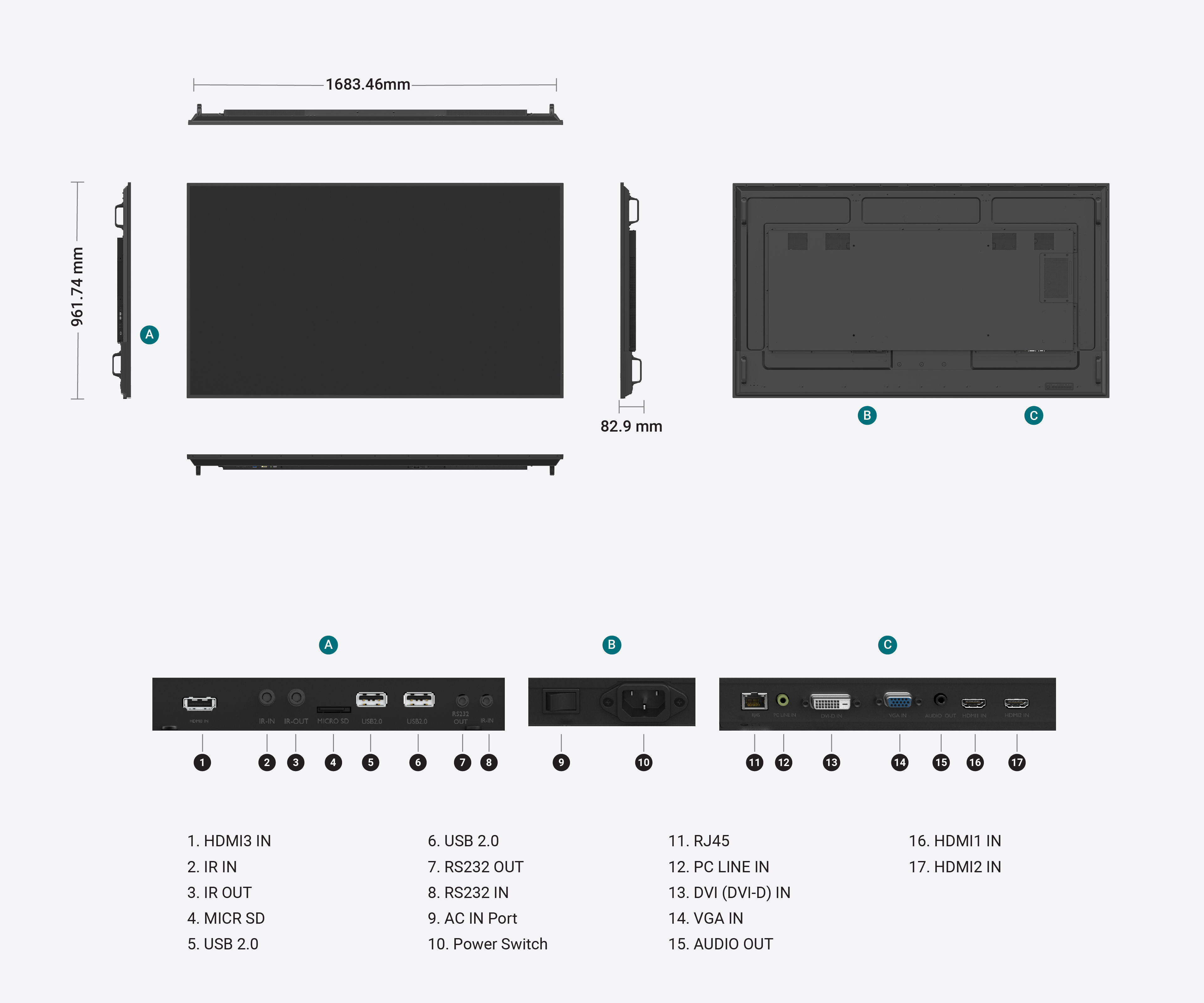 1683.5 × 961.7 × 82.9 mm (66.3 × 37.9 × 3.3 inch)