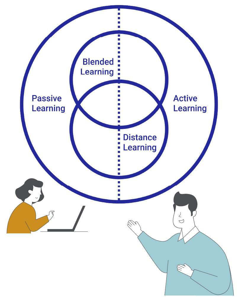 學習過程結合了面對面學習和透過即時視訊會議進行的線上學習。