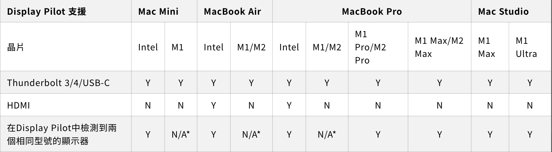 以下表格顯示了DisplayPilot與不同Mac設備的兼容性詳細信息。