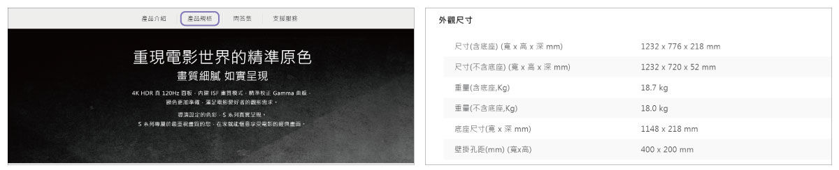 ▲可參考電視機的尺寸,來對照擺放空間是否足夠,尺寸(含底座)這欄的資訊才是我們要看的。