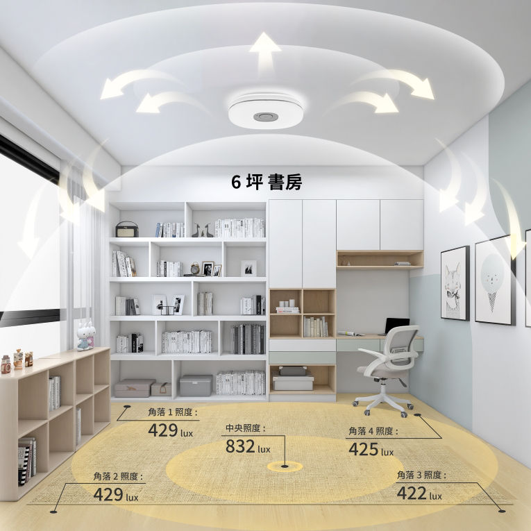 超高透光率的上燈罩,能夠透過漫反射,均勻地補充主燈無法照到的角落。照度達到300Lux,柔和地照亮天花板和牆壁。