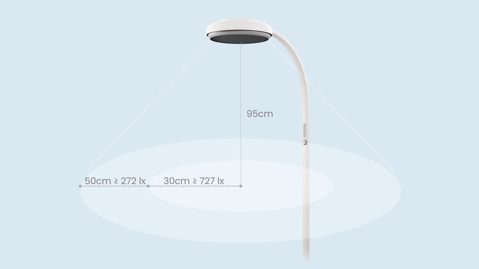 *量測條件為燈頭水平距離桌面高度95公分,燈具調整至色溫4000K最高亮度,照明範圍可能會有10%的量測公差。