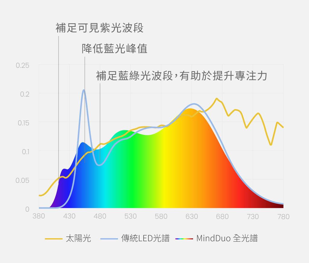 根據研究顯示,亞洲地區在18歲前的學童超過 80%,且有提前化、普遍化與高度化的趨勢,亞洲正進入「近視大流行」的時代! 面對這場「近視大流行」,守住孩子的視力黃金期,成為每位家長的重要課題。 MindDuo Max 採用科學實證的全光譜配方,透過補紫光、降藍光的精準波長設計,有效幫助延緩近視發展,守護孩子視力健康。