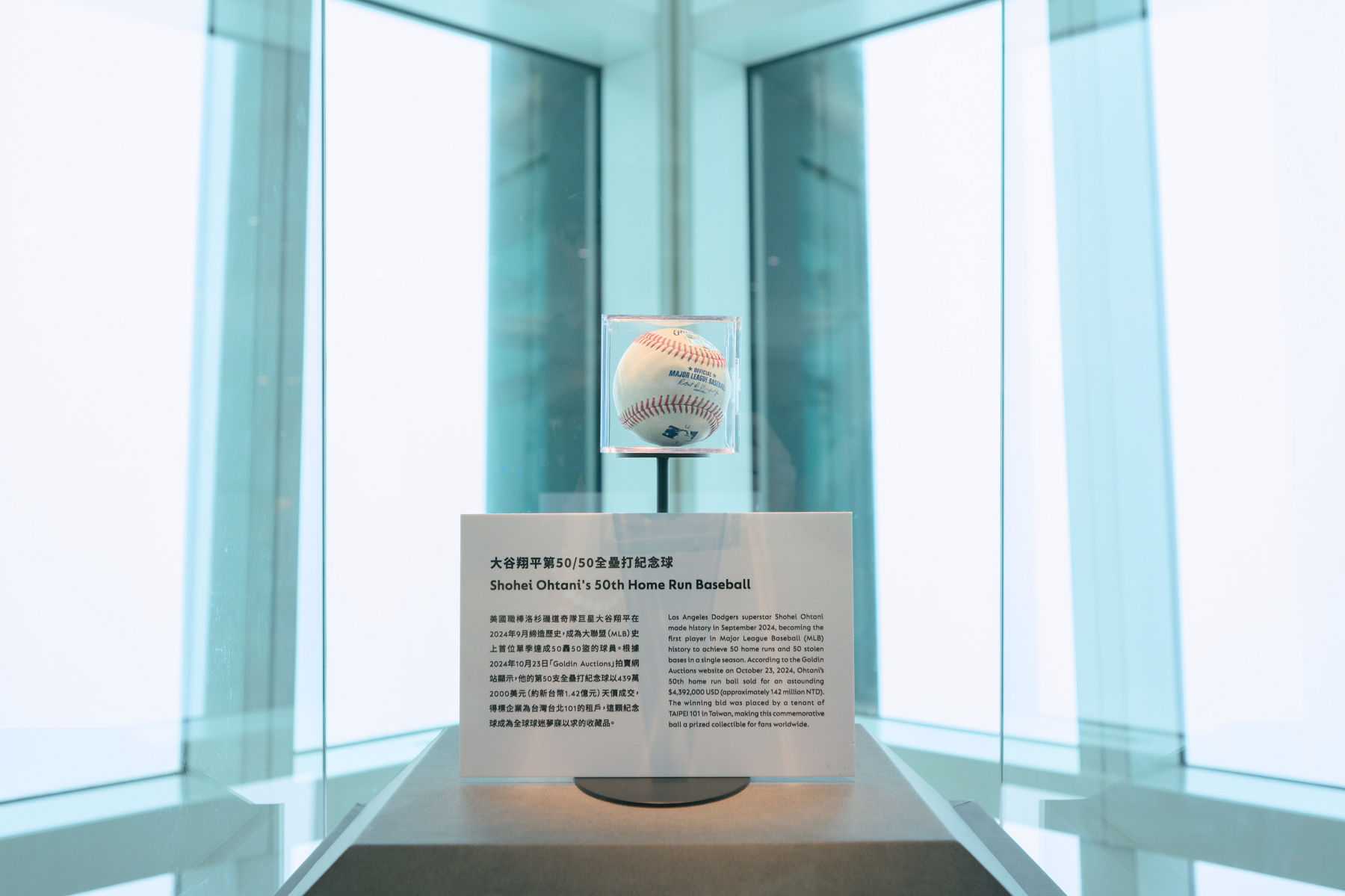 美國職棒球員大谷翔平在2024賽季締造「50轟50盜」驚人紀錄,這顆以1.4億元天價售出的「50/50紀念球」,將在台北101觀景台與大眾見面。台北101觀景台自 2024年11月13日起至2025年3月2日推出「夢想高飛」特展,本次展出由優式資本無償出借的「50/50紀念球」,現場也展出藏家借展的大谷翔平棒球衣及棒球帽等珍貴藏品,以及台灣棒球名人堂協會友情出借陳金鋒與王建民的簽名球、棒球衣、棒球帽及王建民的首勝出賽表,讓展覽增添台灣棒球傳奇風采。