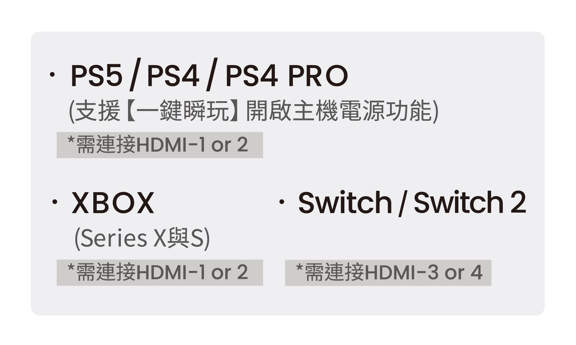當 HDMI 端口直接連接新世代主機時才可啟動 GAME ZONE 操控功能。