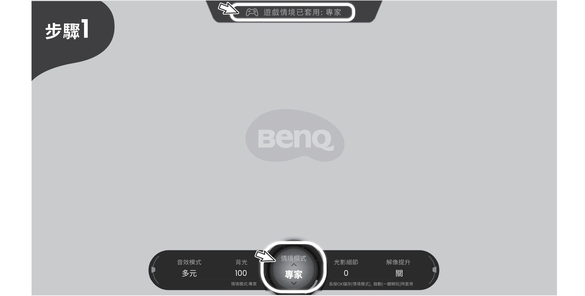 • 若電視為初次開機,在【遊戲中控台】>【情境模式】>【專家】下,按下遙控器的 OK 鍵,系統將自動導引至下載【BenQ 獨家遊戲特調】的連結。