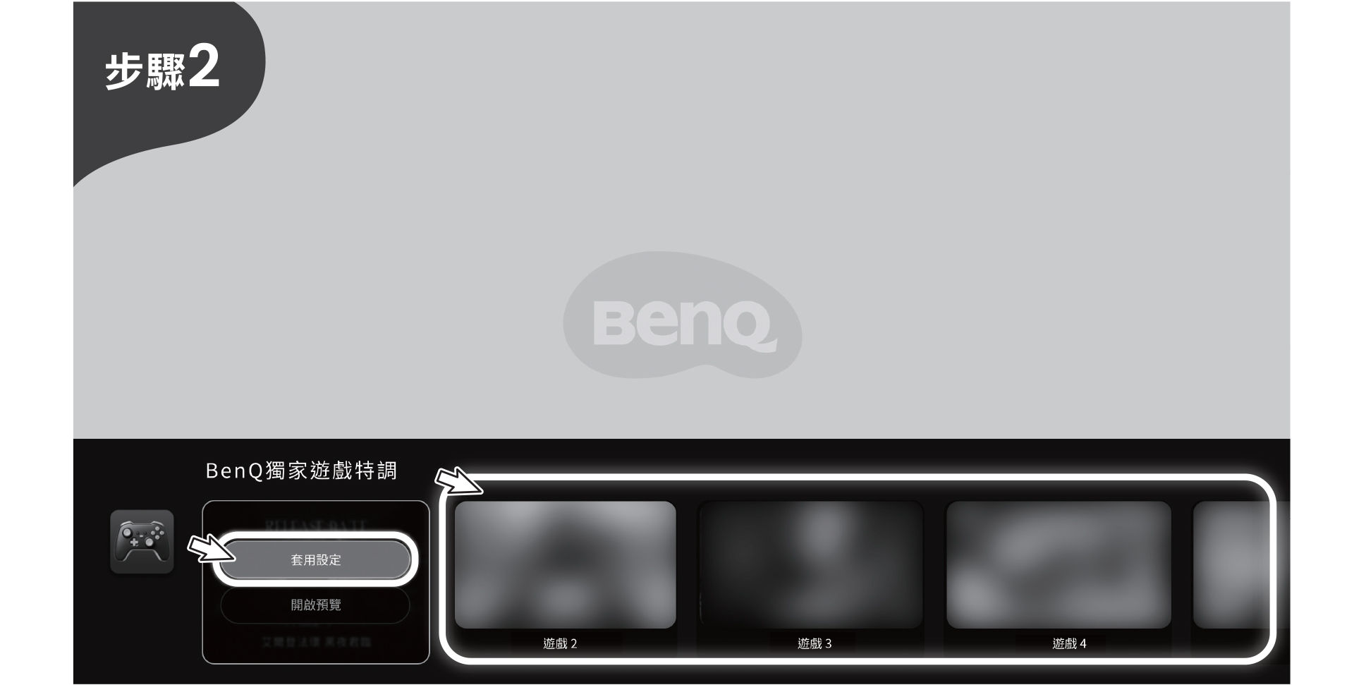 • 在電視連接到支援的遊戲機後,按下遙控器的【遊戲中控台】鍵,在【情境模式】>【專家】中,可開啟【BenQ 獨家遊戲特調】,即可選擇想要的遊戲畫質特調,下載後套用至電視上。