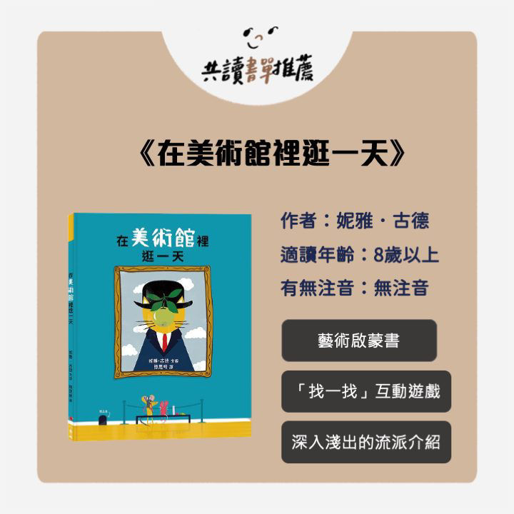 正值暑假的空閒時間,即便疫情目前有趨緩現象,不過還是有不少人選擇待在家裡,此時不妨可以透過此書,跟著小動物的腳步,逛一逛這本精心設計的繪本,裡頭不僅貼心的幫我們分好藝術上的各類別,用可愛的對話框將資訊清楚的介紹,此外也有在書中各角落暗藏不同線索,讓閱讀時就像在玩尋寶遊戲,藉由玩樂的過程中,將各時代的藝術作品以更有趣的方式理解,相信透過書中生動的介紹,就彷彿真的去到了美術館,暢遊在美術的氛圍中。
