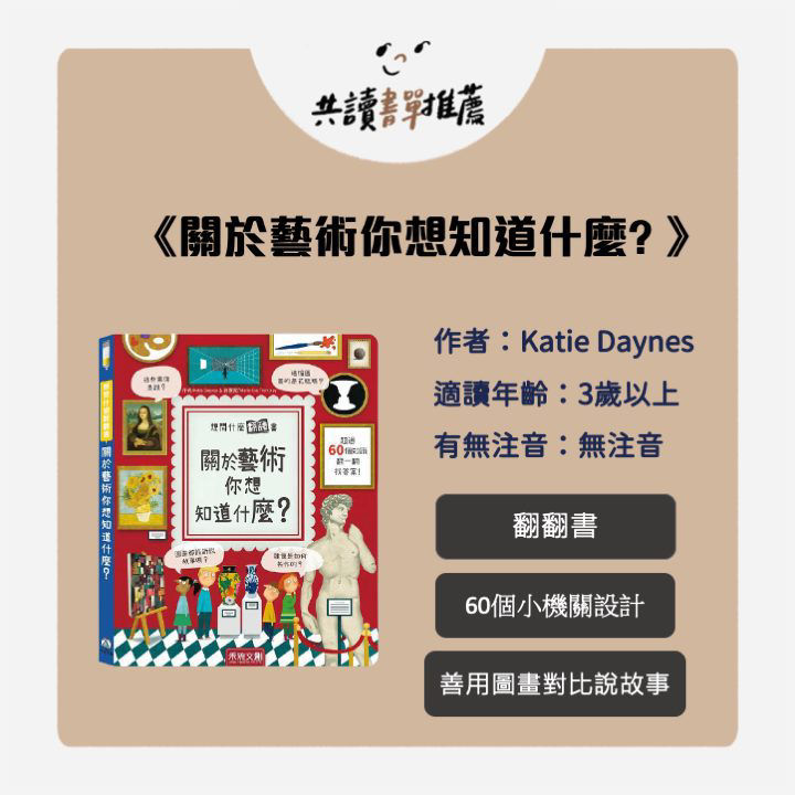 書中就以此痛點為出發點,用簡單的文字、生動活潑的圖片和書中暗藏的小機關讓讀者可以盡情探索藝術的相關的歷史和資訊。每篇都會利用不同的疑問句來刺激思考,像是「任何東西都可以變成藝術嗎?」,「每個人都可以成為藝術家嗎?」用引導式的問句,幫助孩子可以更專注在閱讀中,並且能夠跟著引導,探索到可能平常不會注意的小細節,帶來更多意想不到的樂趣,為閱讀中增添了許多繽紛色彩。