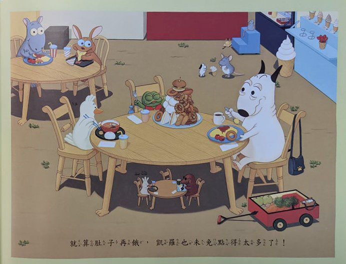 相信有不少大小讀者假日總愛去附近的市場和店家好好走走,順便購物一番,但是有曾好好欣賞每家店的特別之處嗎? 在書中的每間店家似乎都有特別的故事,像是小倉鼠的店舖,獨特的收納方式讓人哭笑不得、河馬的店舖就像玩戳戳樂一樣,難以捉摸裡面藏有什麼好東西。此外書中兩位主角的互動,像是凱羅不小心太沉迷於購物,貼心的包姆趕快把他帶走,或是包姆總是擔心凱羅亂買東西,這些互動就像是講述平常我們的衝動購物的壞習慣一樣,讓故事讀起來充滿生活中的影子。