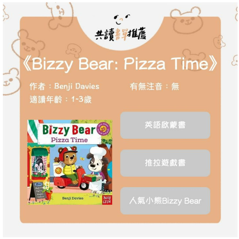 Bizzy Bear是英國超人氣系列英文繪本,全球熱銷超過五百萬冊,除了小熊上學的故事之外,繪本中也有五個小機關,可以讓孩子在閱讀的同時,也享受互動的樂趣。此外,繪本故事內容也是念起來朗朗上口,有押韻的故事,可以讓孩子邊讀邊培養語感。