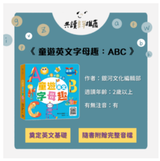 在親子共讀的過程中,家長不妨可以試試看在透過書中的圖畫設計,尋找相關的圖案,引起學生興趣,讓孩子像在玩尋寶遊戲,找到圖案後,在播放音檔同時也可以讓孩子手指沿著字母描寫,聽覺和動作的配合,讓字母的發音和寫法可以對應,並且強化記憶,打破以往光會寫卻不懂得發音的困境。