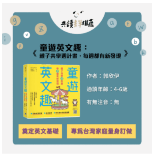 作者透過多年英文教學的經驗,找到孩子與家長的學習痛點,像是環境上的營造、時間上的陪伴、及學習動機的建立等,將書本的內容設計成適合大小朋友一起共學的計畫,每個主題都切割成7部分,每個部分循序漸進,每天只需要10-15分鐘,就能輕鬆有效的讓家長可以陪著孩童學習英文。