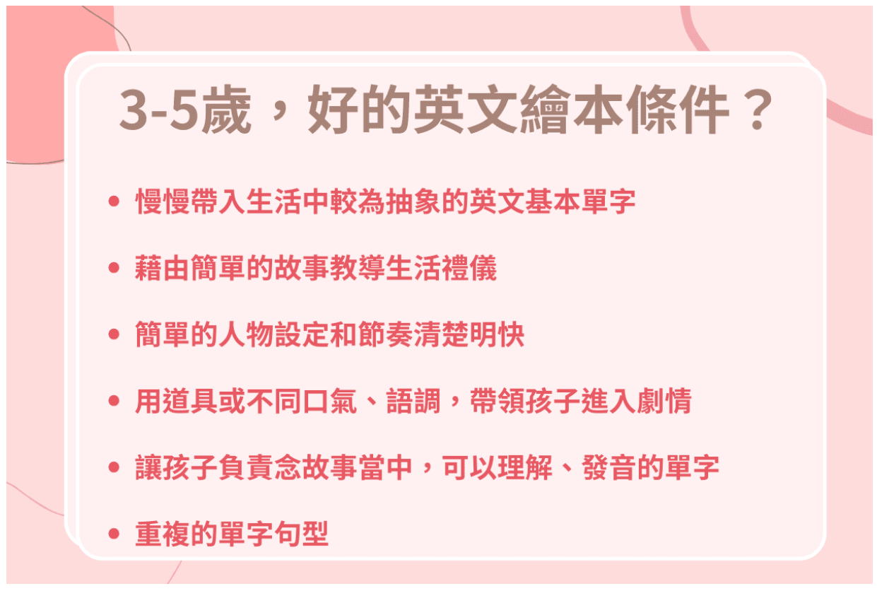 以下整理了3個挑選英文繪本時,應該注意的要點: