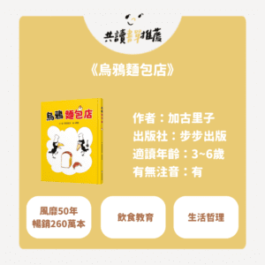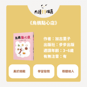 繼1973年推出《烏鴉麵包店》,橫跨三代之後作者終於回應讀者的殷殷期盼,帶著一系列的續作回歸書壇!在這段期間麵包店的四隻小烏鴉也長大囉!第一彈《烏鴉點心店》描述烏鴉大哥巧克力嘗試為麵包店開發點心新商品,從遭遇挫折一路到成功製作出美味點心的故事。故事中可見大哥巧克力勇於跨出舒適圈、挑戰新事物的魄力,以及甜點小天才美美虛心請教、聆聽他人建議的美德,讓孩子不單純只是在閱讀書中有趣的小故事,也可以將巧克力和美美當作榜樣,培養勇敢與謙虛的處事態度噢!