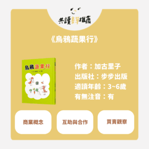 本書最大的特色在於用簡單的小故事,向孩子清楚的呈現商業買賣與定價的邏輯,也引導孩子思考在這樣快速變動的社會,要如何同時考量各方的期待與需求,靈活地想出解決方案。讓我們翻開繪本,和烏鴉家庭的大姊蘋果一起成為充滿創意的小小商人吧!