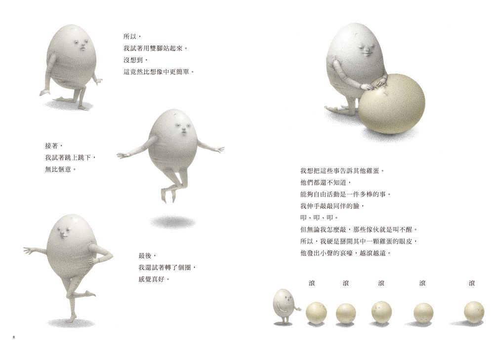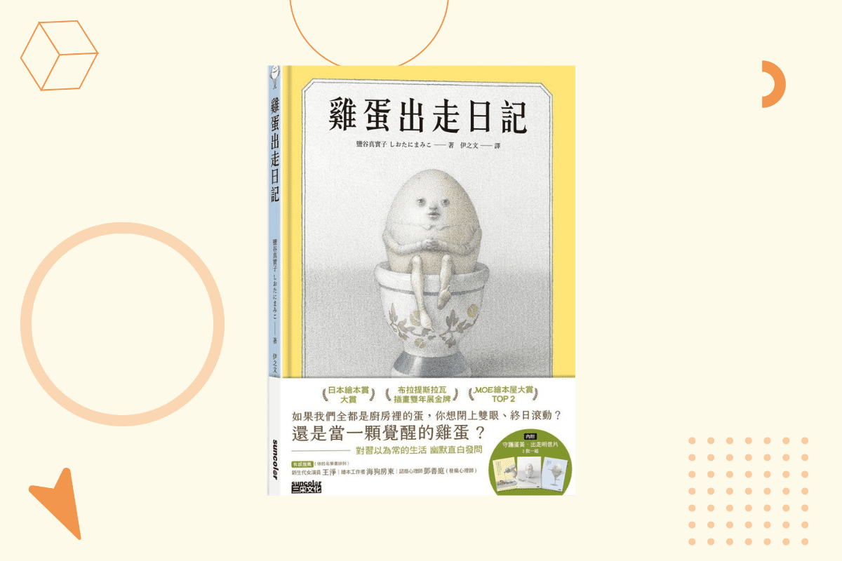 《雞蛋出走日記》是一本極富想像力和療癒力的繪本,故事的主角是一顆沒有名字的普通雞蛋,因厭倦了每天在廚房與其他雞蛋們一同躺著,於是決定睜開雙眼出走冒險,去看看身邊周遭的一切事物。這本書帶領讀者進入了雞蛋眼中的世界,並講述了一些關於認識自我和探索生活環境的過程。書中主角雞蛋講述的故事沒有強烈的調性,就像一顆白雞蛋一樣平凡,而他的旅伴棉花糖也擁有著相似的溫和性格,雖然他們對不同事件的理解或觀念有所出入卻也能夠嘗試了解對方的想法,對於孩童來說閱讀這本書可以跟著這對初來繽紛世界體驗日常的旅伴一同學習生活中的哲學;若是年紀較大的讀者也能透過本書拋開所有束縛,將自己的心靈回歸至最純淨的樣貌並且重新探尋自我的初心。