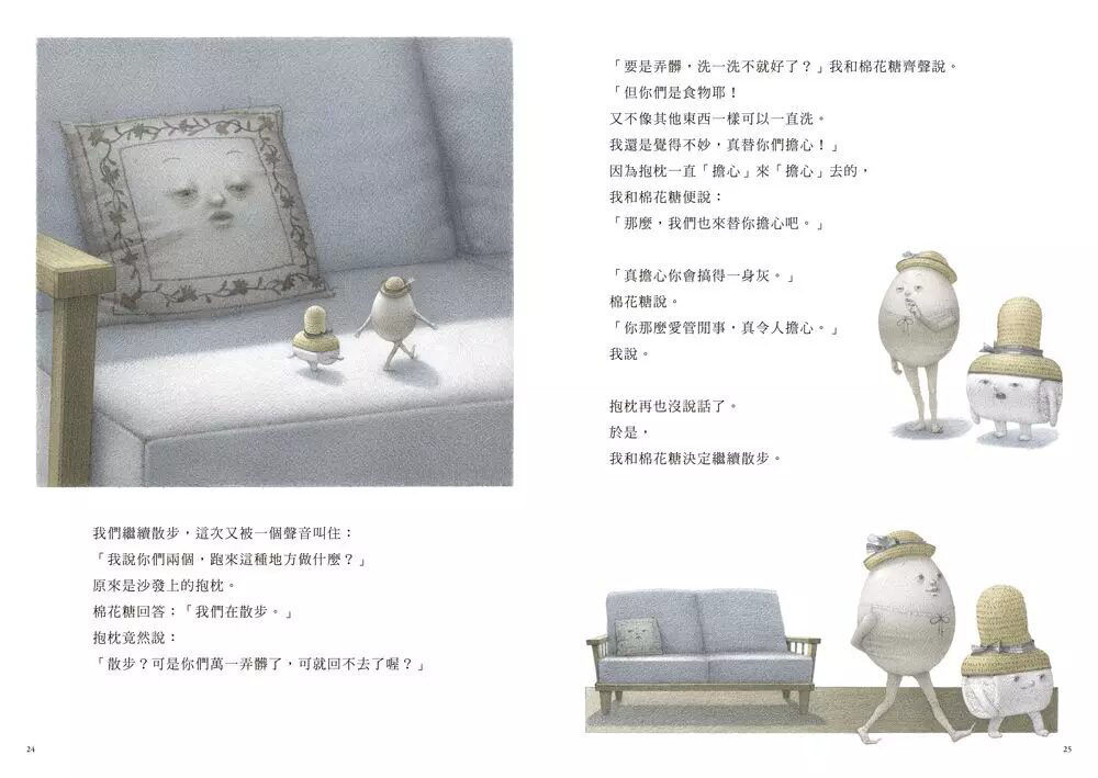 經過一段時間的相處以及磨合,在棉花糖的提議下他們從廚房開始了他們的旅程,期間他們遇到了盆栽、抱枕與時鐘,每個角色有著迥然有異的個性,就像是現實生活中每個人因各自生活成長的背景不同所以會有自我主觀的意見一樣。而繪本中描繪的一些生活化場景,例如面對對方帶刺的言語,雞蛋他們的態度可以說是有些魯莽或是過度自我,但透過雞蛋初來乍到有些不夠圓滑的性格讓作者想透過文字的傳達的生活道理多增加了一點幽默感,相較教條式的描述什麼才是做人處事該有的模樣,對於孩子來說用詼諧有趣的故事對話更能讓他們感同身受,共感某些行為的荒謬與言語的不當。