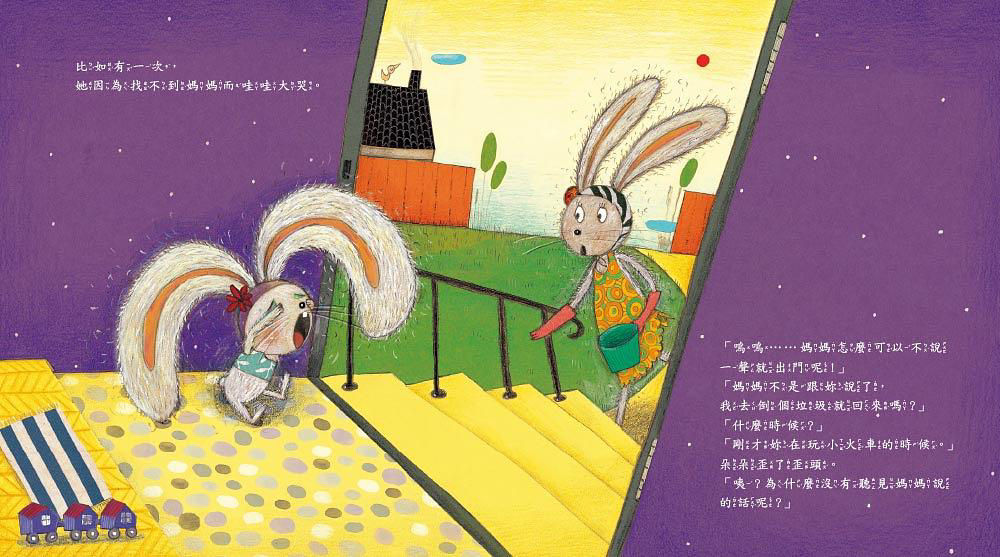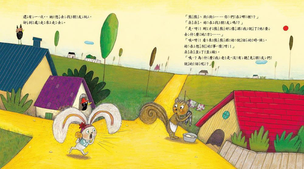 但也正是被「吃話蟲」這樣一激,朵朵不甘示弱,他立志要讓自己成為一隻認真聽人說話的兔子。他也開始發現,原來只要別人說話的時候,仔細地盯著對方的眼睛,自然而然就可以把注意力放在對方身上了。