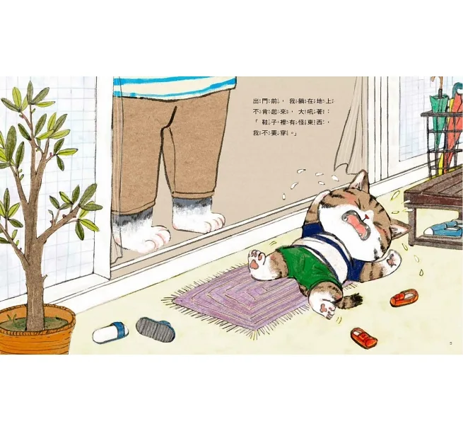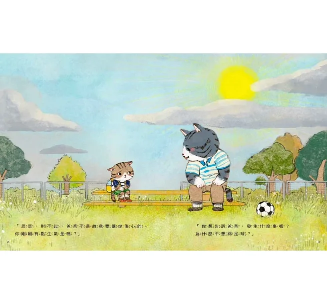 繪本《爸爸,我不要踢足球!》中的貓咪家庭也有同樣的困擾,作者羅寶鴻以這樣的家庭日常作為故事主題,透過辰辰和爸爸的對話和行動,展現該如何與耍賴、鬧脾氣的孩子相處,以及發生衝突事件時家長的應方式。親子共讀時,雙方皆能輕鬆的帶入書中角色,藉著故事情節的推展,練習同理對方的情緒並且嘗試了解對方,不僅引導孩子正確處理自己的情緒,也協助父母逐步改善親子間的溝通方式,成為孩子引以為傲的堅強後盾。