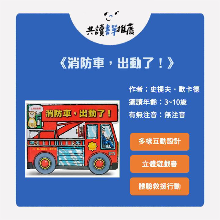 書中設計超過20種的活動式零件,讓讀者可以邊學習消防知識,邊運用活動零件來做更多延伸活動,此外書中設計立體場景,將遇到火災的整個局面更完整的顯示出來,了解到消防人員會如何進行分工,每種工具的運用情境,在親子共讀時,更可以讓孩子自己去觀察場景的狀況、探索裡面的線索並學習火場的逃生知識,讓學習更加全面。