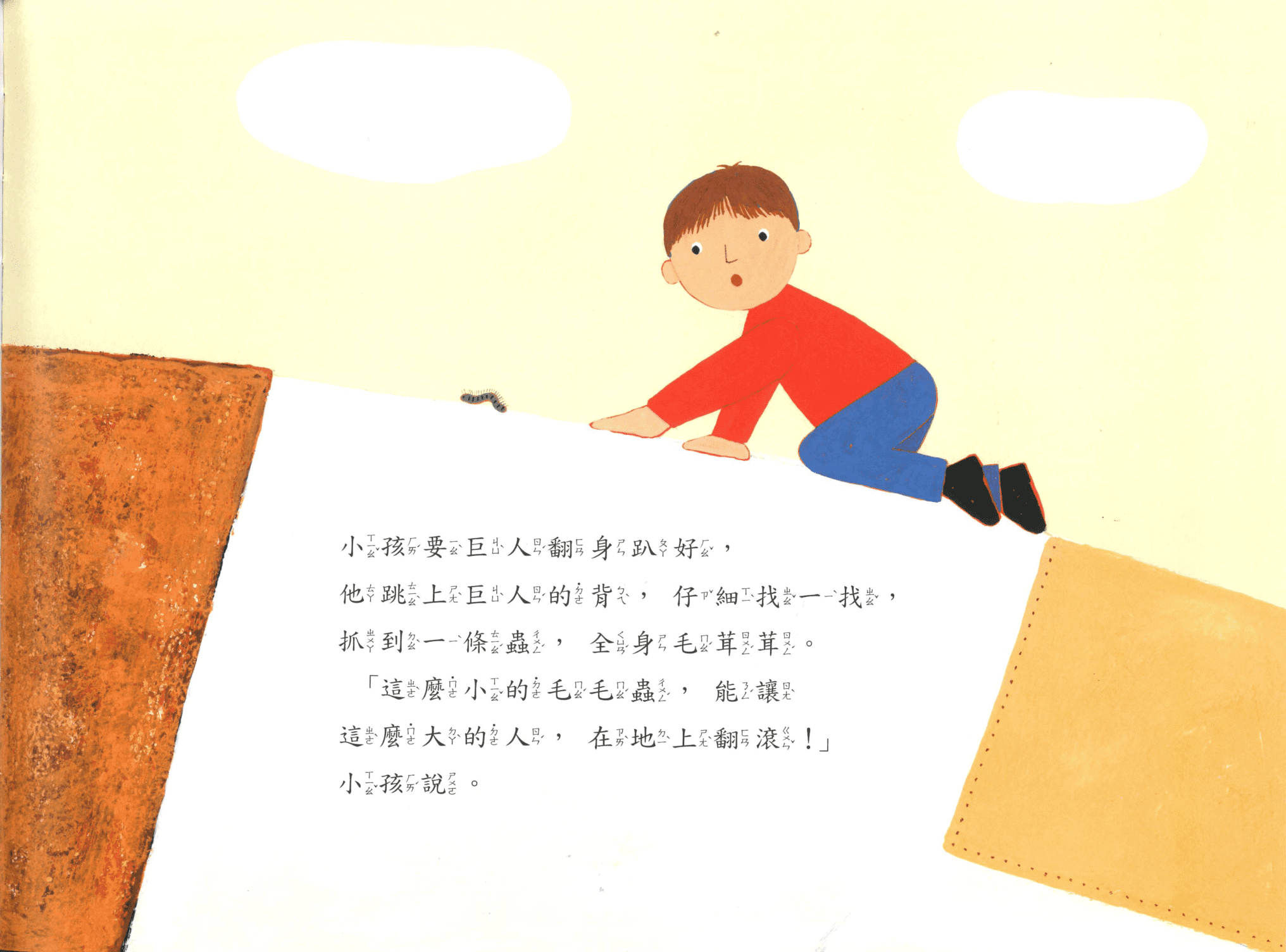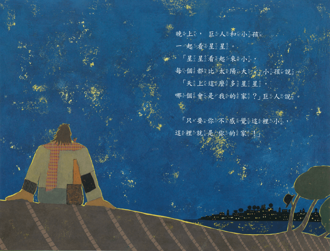 藉由小的小孩與大的巨人的對比,讓孩子知道如何善待自己也友愛他人。其中富有節奏的文字與循環句型的運用,更令繪本讀來活潑生動、琅琅上口。