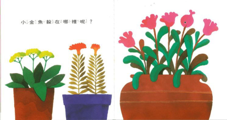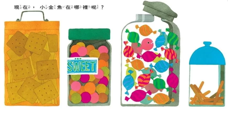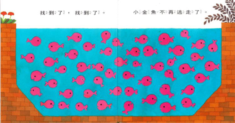 儘管自然就好毋須刻意,但這本書又巧妙地將這樣的學習,轉化成一隻逃跑的小金魚的故事。小金魚和逃跑,都是孩子可以輕鬆理解的情節。將學習化作故事,其實也正是讓孩子能夠有邏輯地去思考眼前所發生的事物。