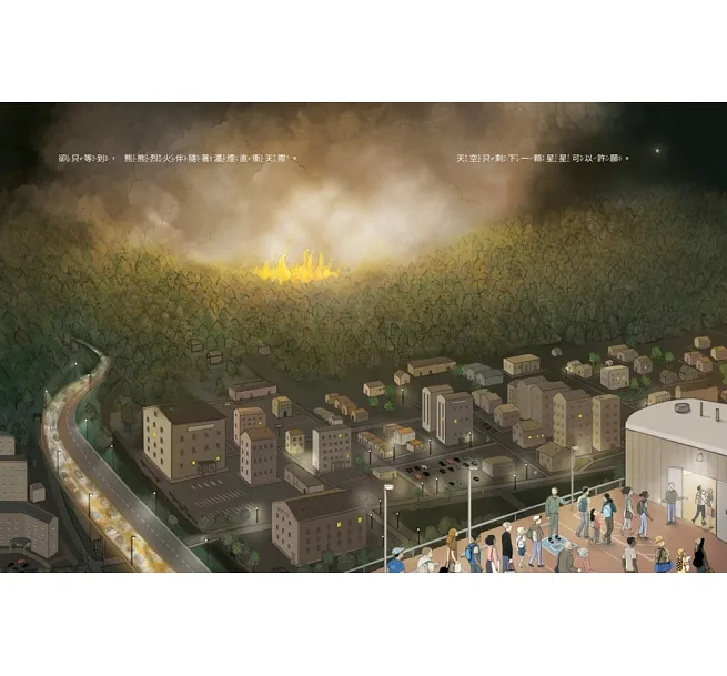 從森林大火為題出發,這是一本描繪自然的繪本,但同時這也是一本講述當下現況的繪本。發生在今日的氣候變遷,是引致森林大火的相關因素之一。直視森林大火所造成的苦難(無論是對於樹或是對於人),我們(特別是被建成環境所圍繞的都會人群)也都將更能夠體認到氣候變遷所造成的深遠影響。