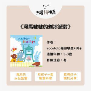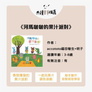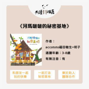 河馬啵啵系列繪本,是由 accototo 福田敏生與明子一同打造的系列繪本,他們擅長以動物為主角,設計出各種生動有趣的情境。河馬啵啵因為善良助人的個性,除了結交到一群熱心的朋友,也一起完成了很多有趣的事情!透過故事中的秘密基地、果汁、挫冰等設定,引發孩子的好奇心,並藉由翻閱繪本的過程中,學習如何與人相處與互相幫助。