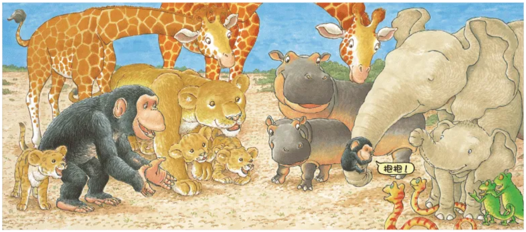 森林裡有一隻叫「寶寶」的小猩猩在找媽媽,因為他非常想要媽媽的抱抱!而在找媽媽的路途中,他看見大象媽媽與小象在抱抱;獅子媽媽與小獅在抱抱;長頸鹿媽媽也與小長頸鹿寶寶在抱抱。森林中的其他動物媽媽也都在跟自己的小寶貝抱抱,小猩猩寶寶越看越急著想要找到自己的媽媽,不禁嚎啕大哭了起來。此時,小猩猩的媽媽終於出現了!猩猩媽媽在森林中其他動物的注目下,好好地給小猩猩寶寶一個親密的抱抱,而圍觀的森林動物們看到這個甜蜜幸福的畫面,也忍不住歡呼「抱抱!」。