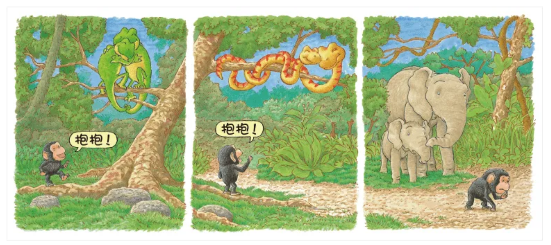 「抱抱」對許多人,特別是孩子來說,是世界上最甜蜜幸福的時刻,當孩子天真無邪的依偎在父母的懷中,感受到的是最真摯的愛與安心的感覺。親子間經常用抱抱來訴說對彼此的愛,而本書正是在描述這種簡單又純粹的親子之情,用最少的文字,搭配動人的圖畫,以及小猩猩細膩的表情變化,精準描繪出他的心境轉折。從小猩猩一路上看見其他動物親子間甜蜜的抱抱,終於忍不住大哭,到後來猩猩媽媽出現時,小猩猩破涕為笑,撲進媽媽懷中的幸福模樣,讓讀者在閱畢本書後,暖暖的感覺在心中可以維持一段很長的時間,並且真切感受到抱抱是親子間最溫暖的互動!