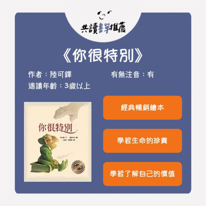 小朋友在成長的過程中,經歷了從爸爸媽媽細心照顧下的個體生活、進入幼稚園、小學的團體生活的不同階段,在學習與同年齡的小朋友相處過程中,孩子會透過他人來認識自己,形成自我的概念,所以這個時期孩子很容易受到他人意見影響,像是故事裡的微美克人一樣,很適合透過閱讀《你很特別》來學習正確的自我概念。