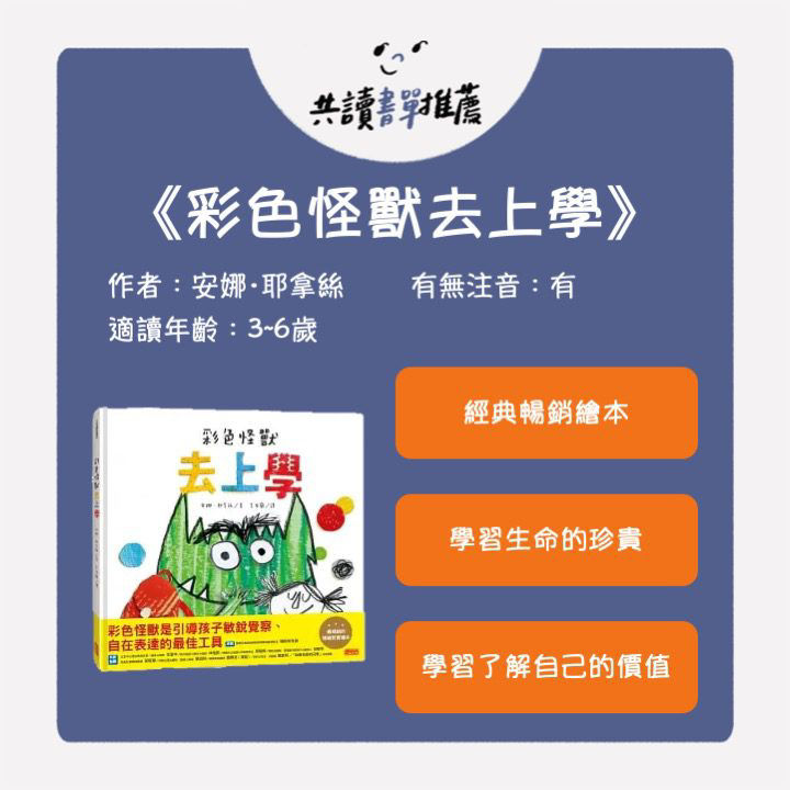 一部分來說,這本書就和所有向孩子介紹學校的繪本一樣,透過各式各樣的事件,來讓孩子們預習、熟悉學校會發生的一切。不過另一部分來說,作者耶拿絲端出自己經典的獨創角色彩色怪獸,便在這樣的主題中玩出新意。彩色怪獸會隨著自己的心情,顯示不同的顏色在身上。爸媽跟孩子便可以藉由彩色怪獸當作討論的素材,一起想一想這些學校中發生的事,會帶給自己什麼樣的「感覺」。