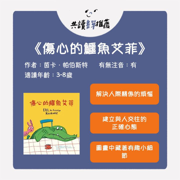《傷心的鱷魚艾菲》講述一隻因為有著大嘴、利牙與大嗓門而讓人害怕的鱷魚艾菲,為了交到好朋友,努力假扮成別人的故事。作者透過主角艾菲想要變成別人卻都失敗的經歷,以及故事最後山豬威利的出現,告訴孩子:我們不可能、也不需要隱藏自己變成其他人,真正的朋友是那些喜歡你原始樣貌的人們!陪伴孩子一起面對人生必經的人際課題,從小建立與人交往的正確心態。