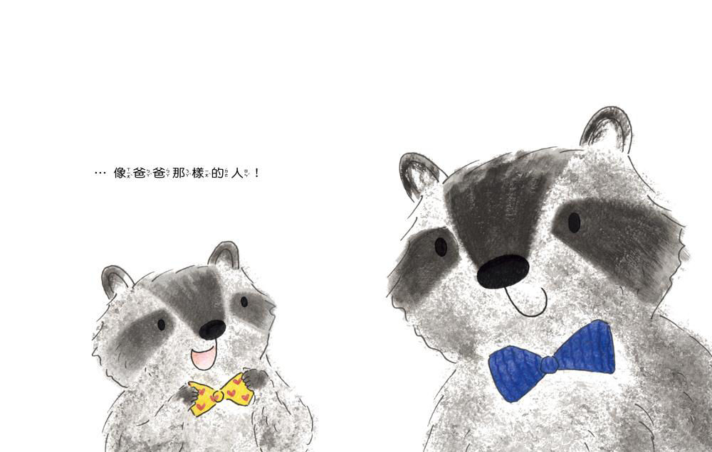 這本書就描繪著浣熊孩子如何想像未來,以及這樣的想像是如何產生自爸爸在生活中的各種表現。在親子閱讀的過程中,爸爸媽媽可以陪著孩子一起想像未來可以成為的樣子,也可以讓孩子知道自己的力有未殆之處,讓他們更瞭解爸爸媽媽的無所不能,背後也是有許多不同的「故事」在。同時,也讓他們知道自己不一定要變得「無所不能」,最重要的是一直記得彼此的好。