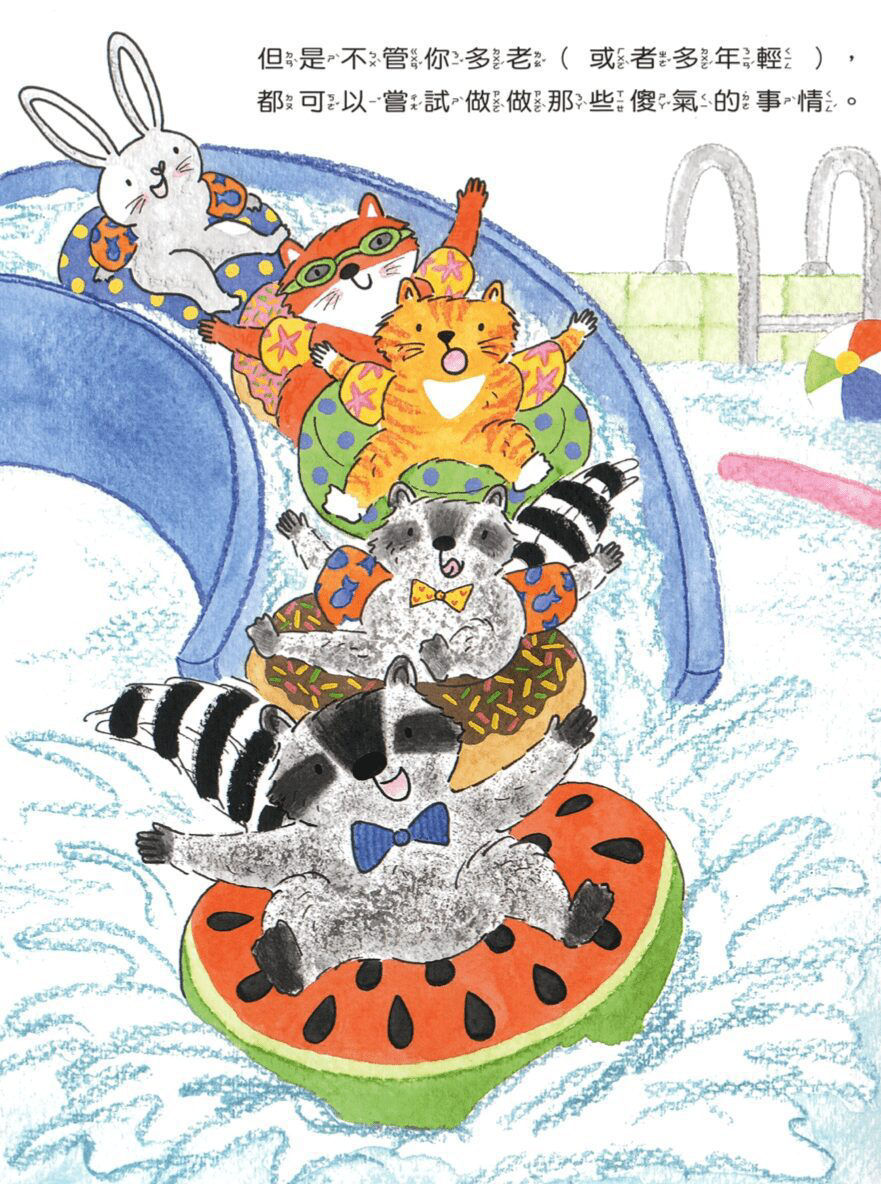 小浣熊在書中便說,爸爸不管長得多大,最棒的一點就是他還是跟我一樣:會有淘氣的一面,也會懂得辦一場最棒的生日派對!除了完美之外,能給孩子最棒的身教之一,也是讓他們覺得自己擁有許許多多最棒的特質,讓他們覺得為自己帶來快樂的作為,都是值得留存下來的。在閱讀的過程中,孩子會不斷地發現,原來自己憧憬的爸爸媽媽,很多方面都跟自己一樣,自己現在的樣子就已經是很棒的自己了。