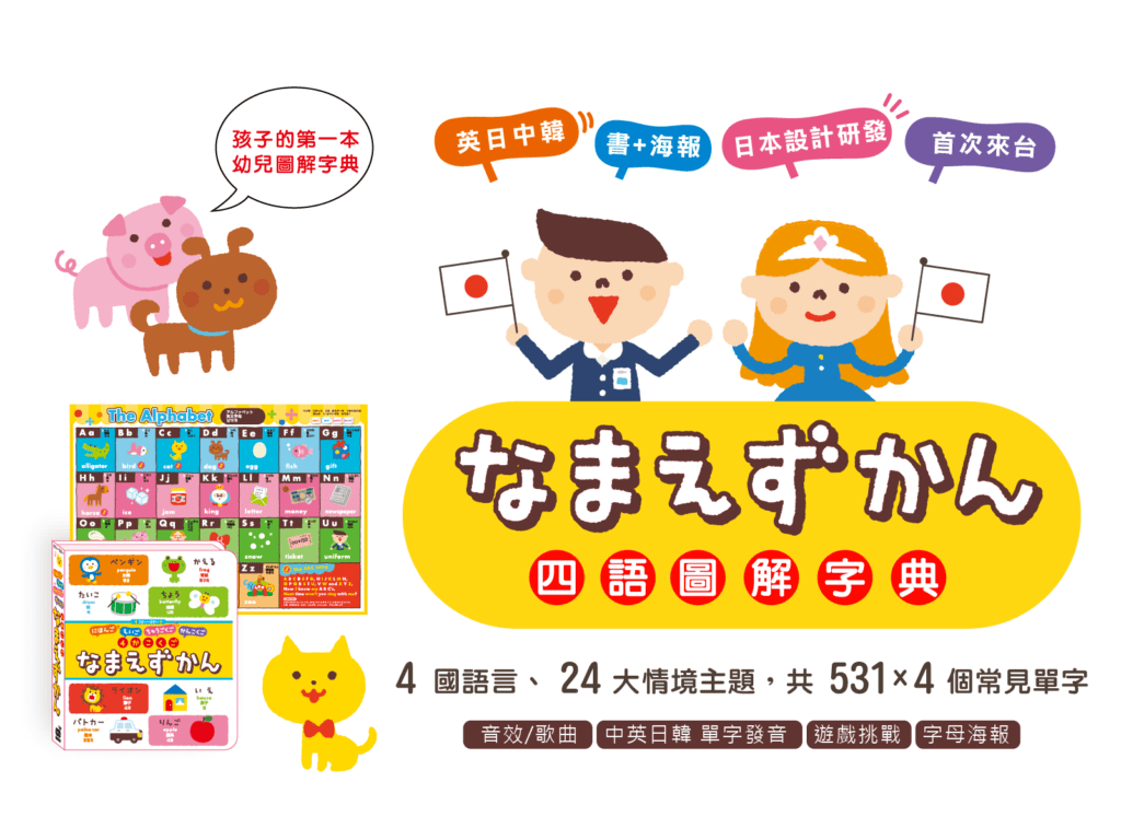 全書內容涵蓋四國語言、24大主題情境、共531X4個常見單字,透過可以本書一次學會中、英、日、韓共四國的常見單字,可謂是擁有超高CP值!透過點讀筆可以輕鬆聽清楚四國常見單字的標準發音,再搭配有趣的音效、活潑的歌曲增加使用點讀筆的樂趣。而語言學習除了單字以外,句子也是語言學習中相當重要的一環,本書也附有實用的對話互動練習,讓小讀者除了記住單字外,還能將單字套用於句子中,活用於日常生活。此外書中內容還加入遊戲挑戰,讓小讀者透過遊戲互動,提高學習自主性,逐步累積強大的語言能力!在外觀設計方面,本書採用硬頁書的設計讓本書更加耐用,並將書本的邊角鈍化處理,提升閱讀本書的安全性。想要透過一本書輕鬆學會四國常見單字的話,本書是你絕對不能錯過的絕佳選擇!