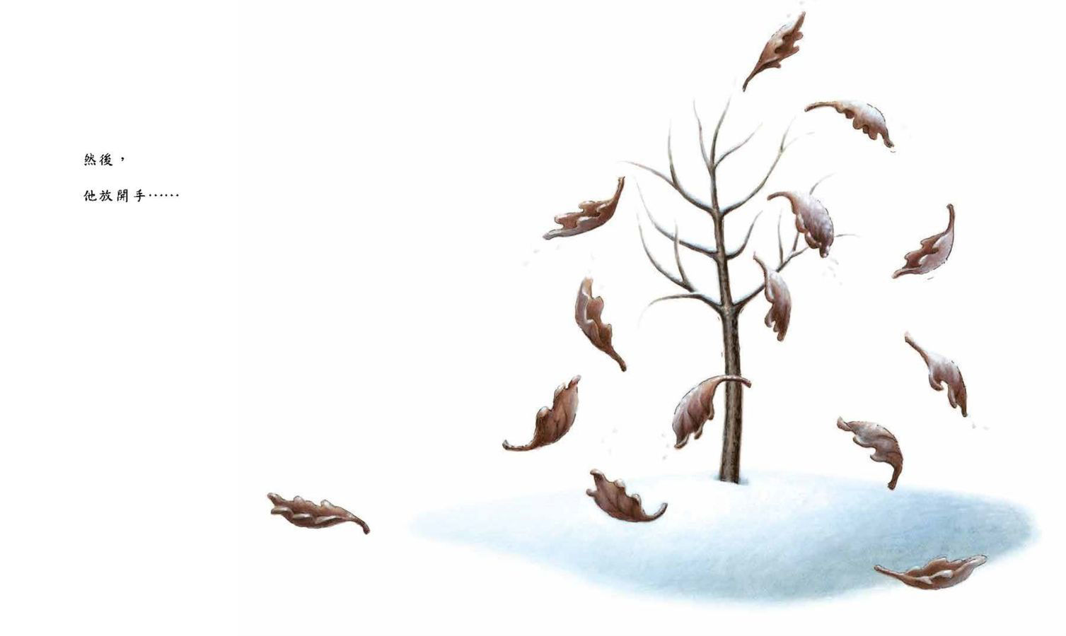在身旁許多小動物的關心與鼓勵下,再次來到某個秋季,小樹終於鼓起勇氣,鬆開手,落葉散了一地,心中的害怕也彷彿悄悄落下,迎面而來的卻是寒冷刺骨的冬季。不過,在歷經寒冬後的春天,小樹重新長出翠綠色的嫩葉,越長越高,越長越大,最後和大家一樣成為了一棵轟立直挺的大樹。