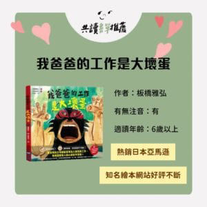 從一無所知、認識、懷疑到最後的包容,壞蛋爸爸的最後一部曲,小男孩帶著孩子最溫暖包容的心胸去接納自己的父親,即便沒有外人稱羨的職業,卻有著更加緊密的連結。透過繪本讓我們有不一樣的思考方式,去接納不同種的職業,也用更深刻的情感去描繪親子的關係建立。