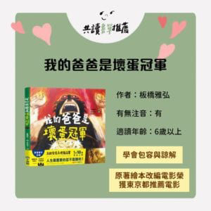 以上介紹的三本繪本,故事環環相扣,無論從劇情、故事曲折到繪圖風格,以一個摔角職業為主題,閱讀時都能感受到滿腔的熱血,同時用一趟認識父親的旅程,情緒轉折間,帶出親子間的難以輕易說出的話題,相信無論是大人或小孩,都能在其中收穫滿滿。