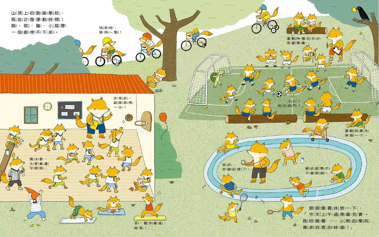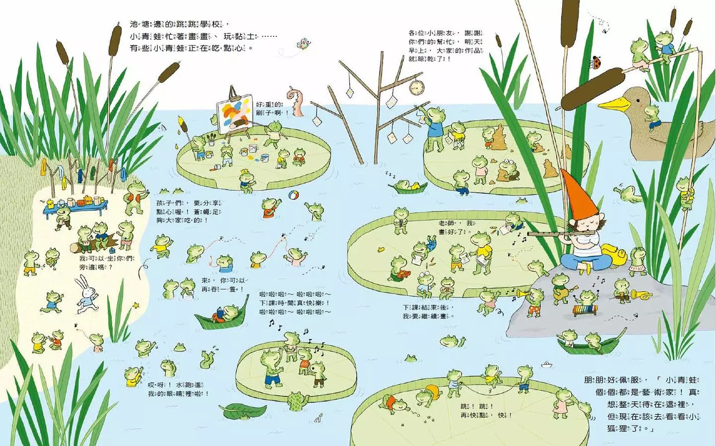 在書中,他精心設計了十所風格不同、學習內容也各異其趣的學校:有小兔子的蹦蹦學校,他們在裡面認真學習算數;也有青蛙們的跳跳學校,他們在裡面開心畫畫、做勞作。
