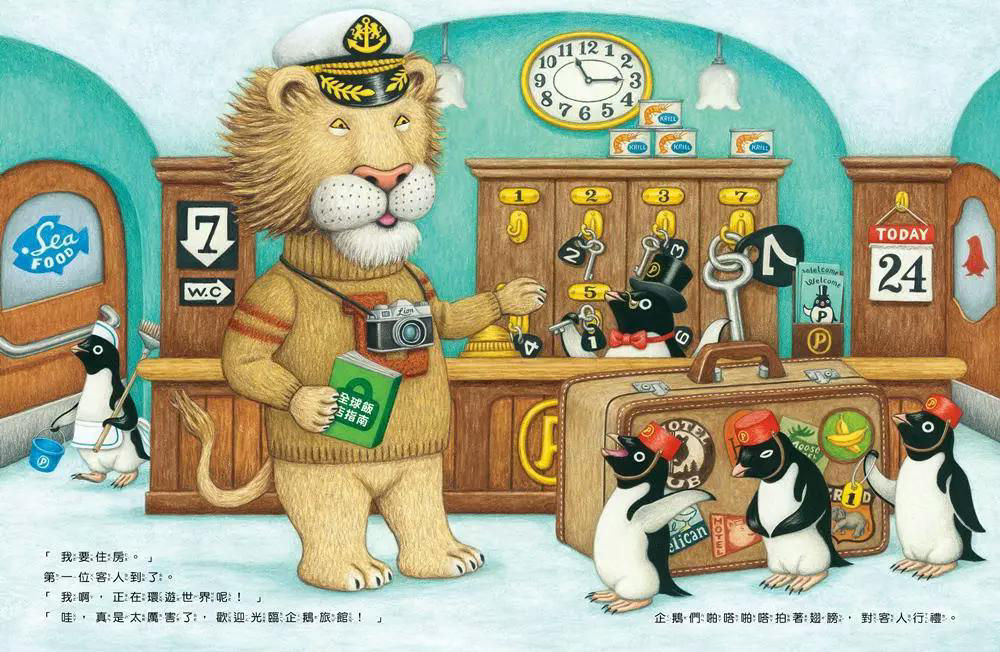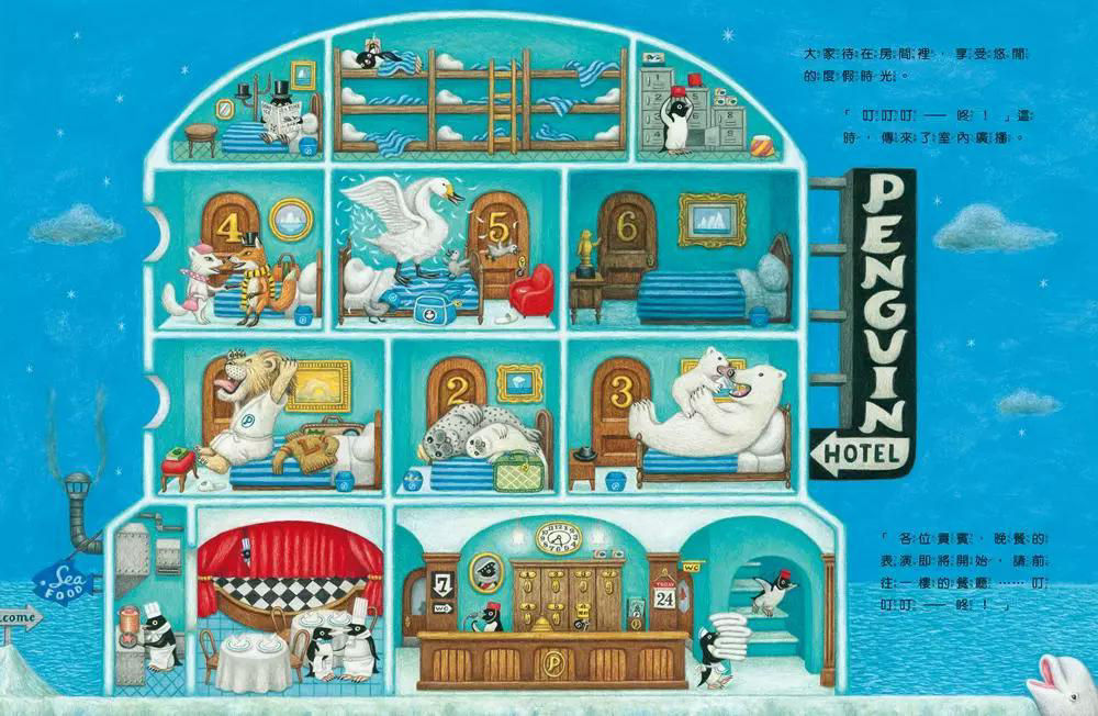 《企鵝旅館》顧名思義從迎賓的櫃台人員、門房到廚師,全都是由小企鵝組成,他們在遙遠的遼闊海洋中,迎接每一位到訪南極的客人。有正在環遊世界的獅子先生、闔家出遊的天鵝家庭、穿戴時髦的狐狸先生,這間飯店甚至能接待來自深海的大鯨魚呢!