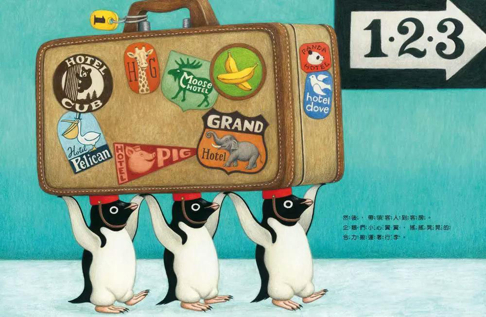 而小企鵝員工與客人們的互動、房間的空間佈置、旅館提供的美食和精彩表演節目,都被作者以精緻細膩的插畫呈現到讀者們的眼前,這也讓者本繪本多了許多可以玩味的細節。爸爸媽媽們與家中的小寶貝一起閱讀時,不妨邀請孩子一起投入故事畫面,找找看每位動物客人的行李長什麼樣子?數數看企鵝旅館總共有幾間房間?為什麼有一把鑰匙特別大呢?