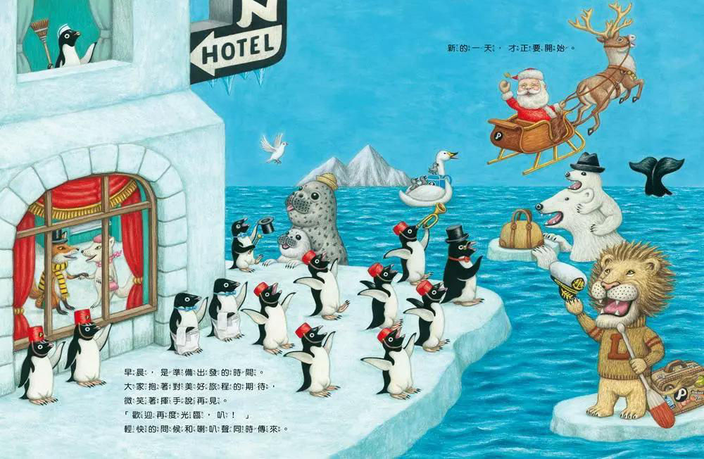 隨著故事來到尾聲,最後一位客人乘坐馴鹿雪橇從搖曳的極光中現身,揭開作者從開頭就持續鋪陳的小彩蛋 —— 沒錯,《企鵝旅館》是一本隱藏版的聖誕繪本喔!這樣的故事轉折想必讓許多讀者非常驚喜,也再次見識到作者縝密的設計巧思和深厚的繪畫造詣。所以如果家裡的小寶貝已經迫不急待想出去旅遊,甚至有些煩躁不耐時,拿出《企鵝旅館》吧!裡頭數不盡的細節,讓每次翻閱都有不同的體驗。在反覆閱讀的過程中,等待出遊的時間就不會顯得那麼漫長無趣了吧!