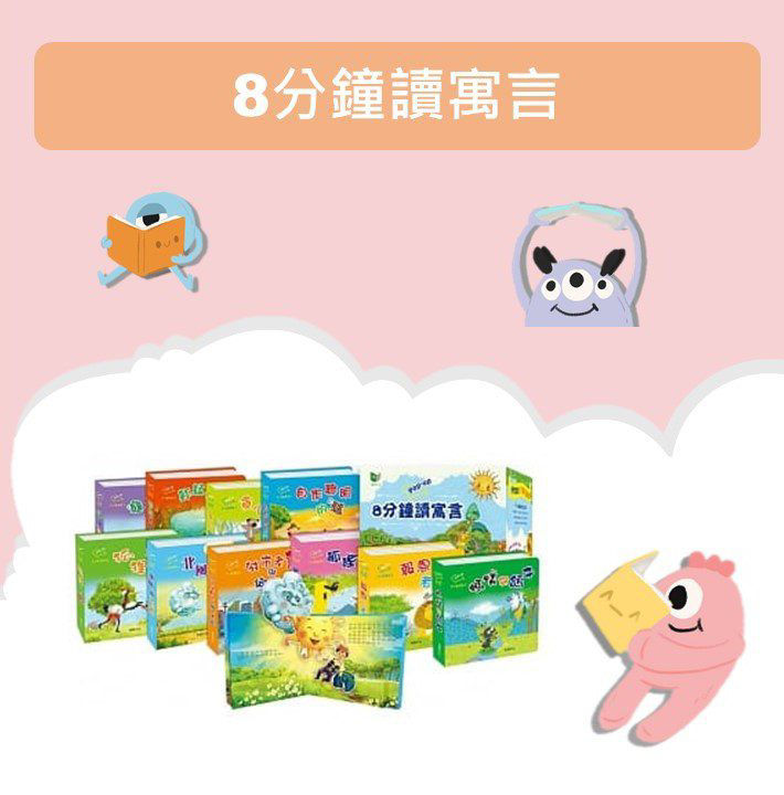 《8分鐘讀寓言》透過立體機關,讓寓言的故事場景更生動。包含龜兔賽跑、太陽與北風、蚱蜢與螞蟻、狐狸與鶴、城市老鼠與鄉下老鼠、狐狸與烏鴉、報恩的老鼠、螞蟻與鴿子、貪心的狗、自作聰明的驢共十篇。