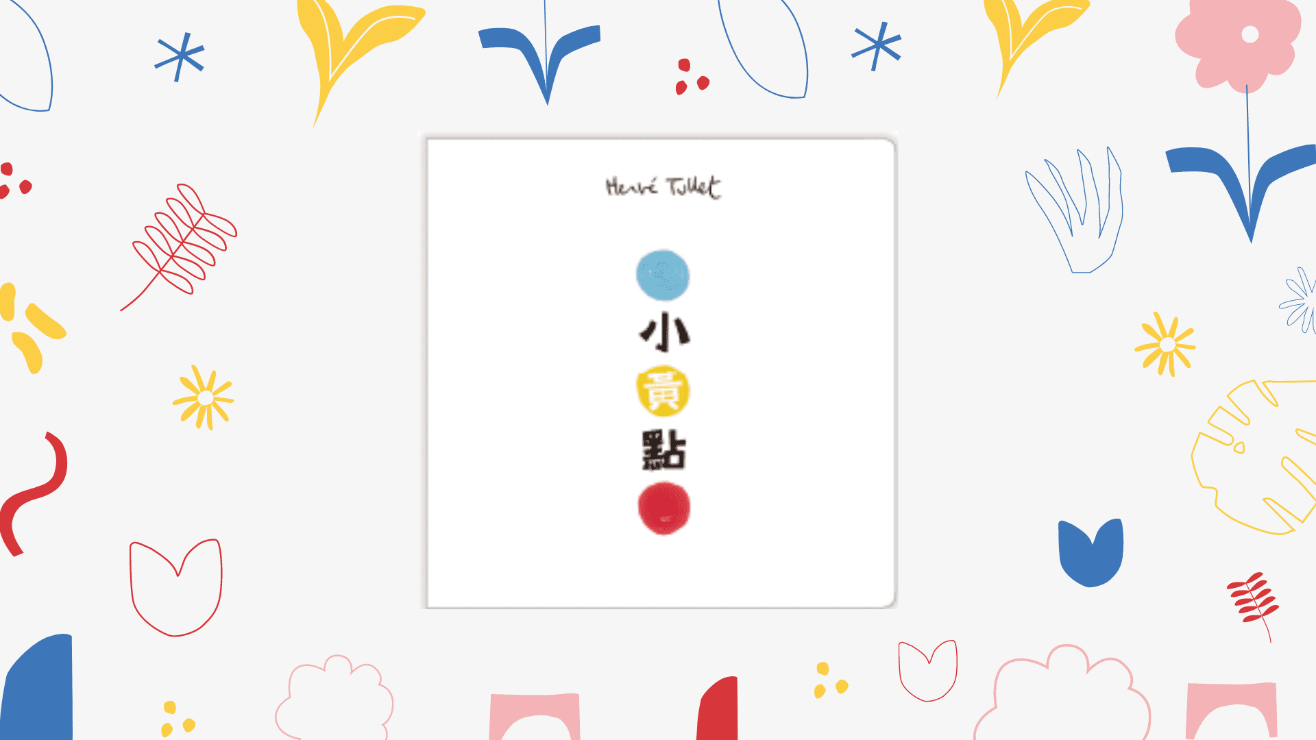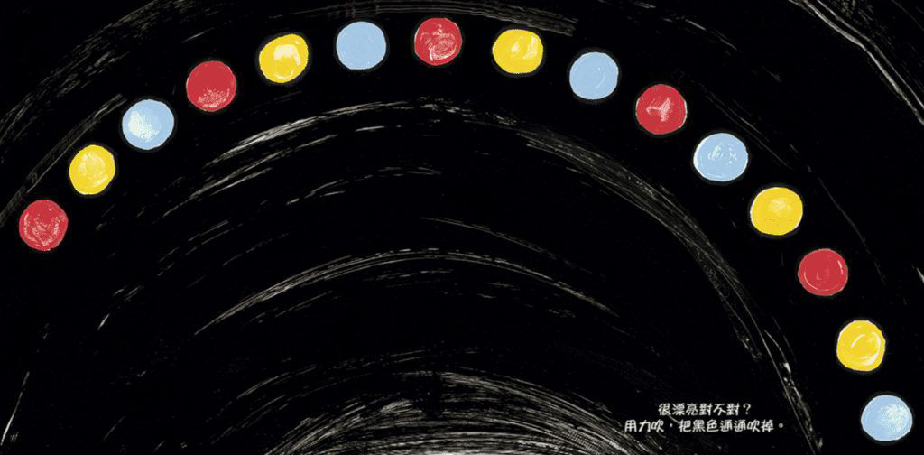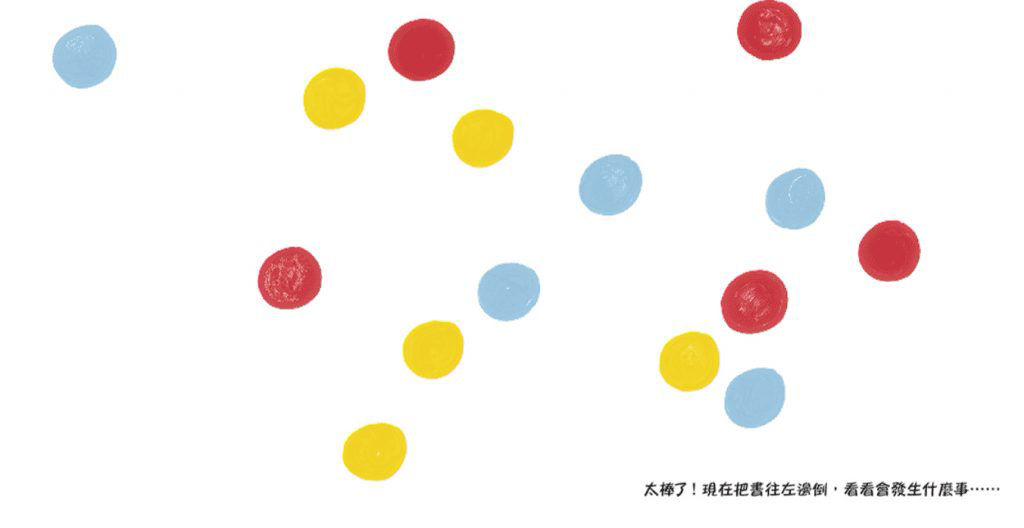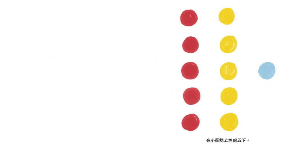 小黃點這本書的內容就是簡單的(簡單到爸爸媽媽或許也可以發揮巧思,親手為孩子設計續集)圖繪——各色大大小小的小藍和小黃,加上一系列有趣的指令。吹一下就把顏色吹走、按一下就讓下一頁的小黃點多出一顆,指令巧妙配上畫面變化彷彿是一台觸控裝置一般。