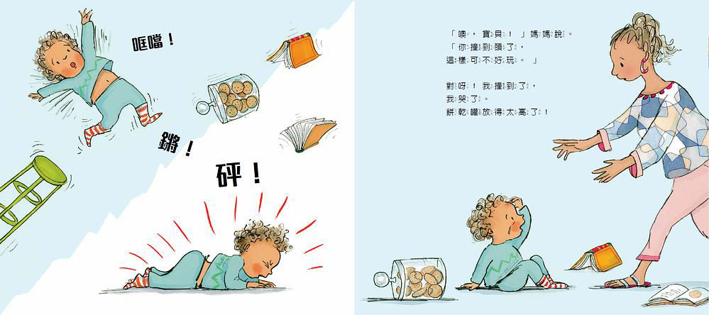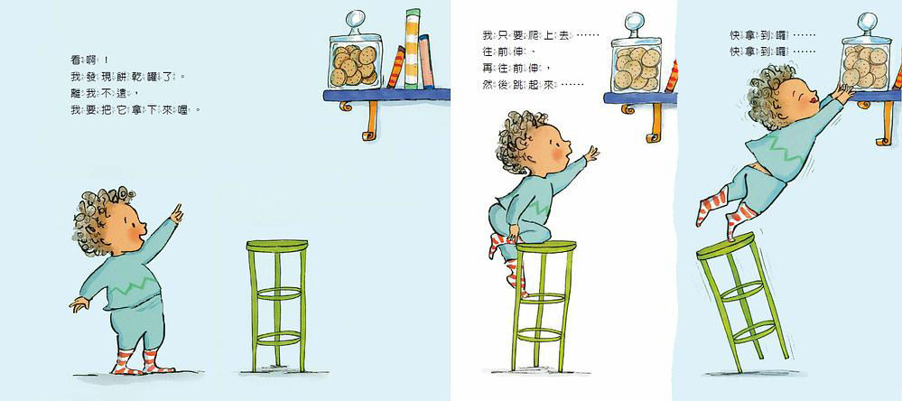 書中的小朋友一開始只是因為想吃放在高處的餅乾,在嘗試拿到餅乾的過程中,卻從椅子上跌落,頭上撞出一個大大的腫包。